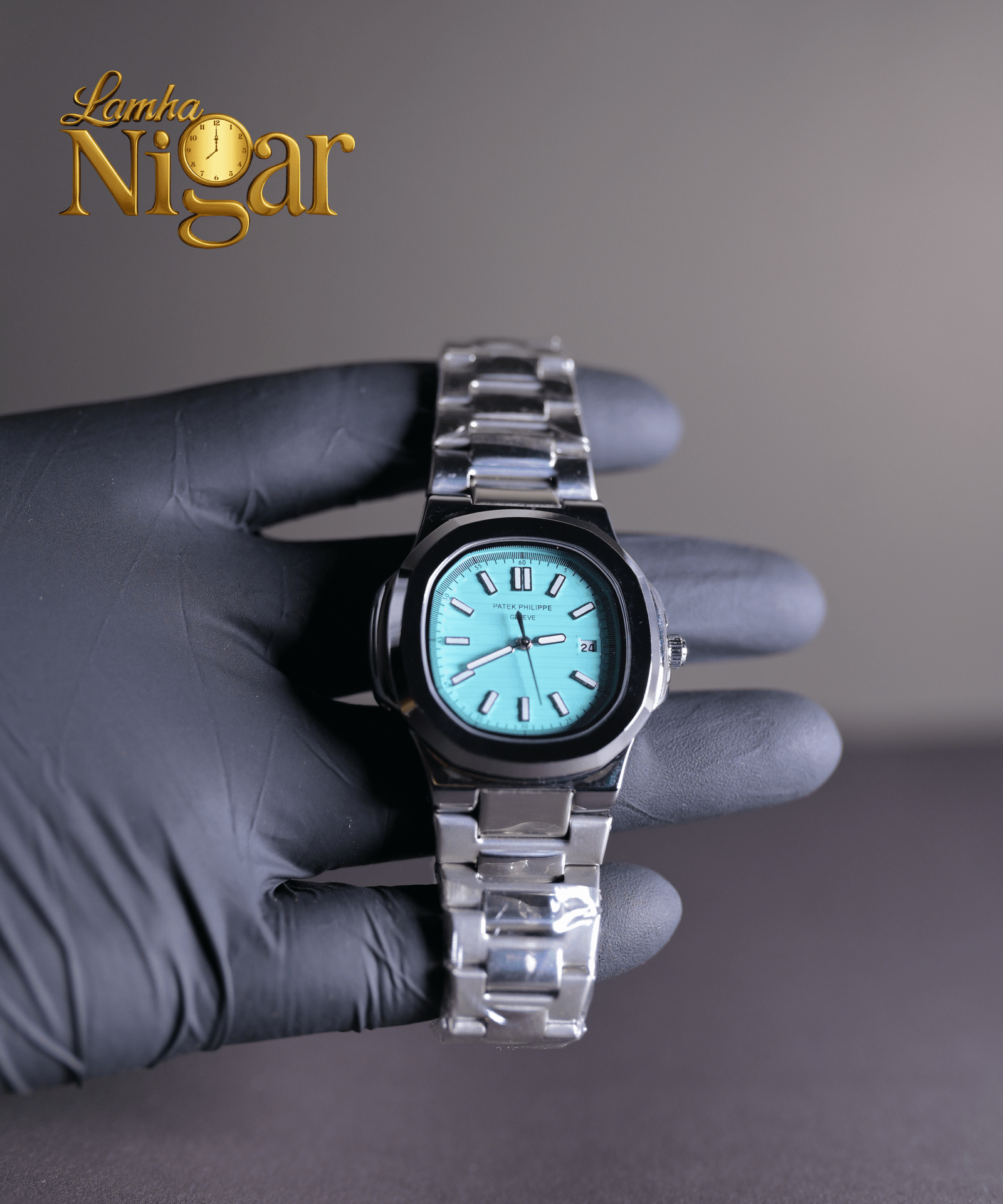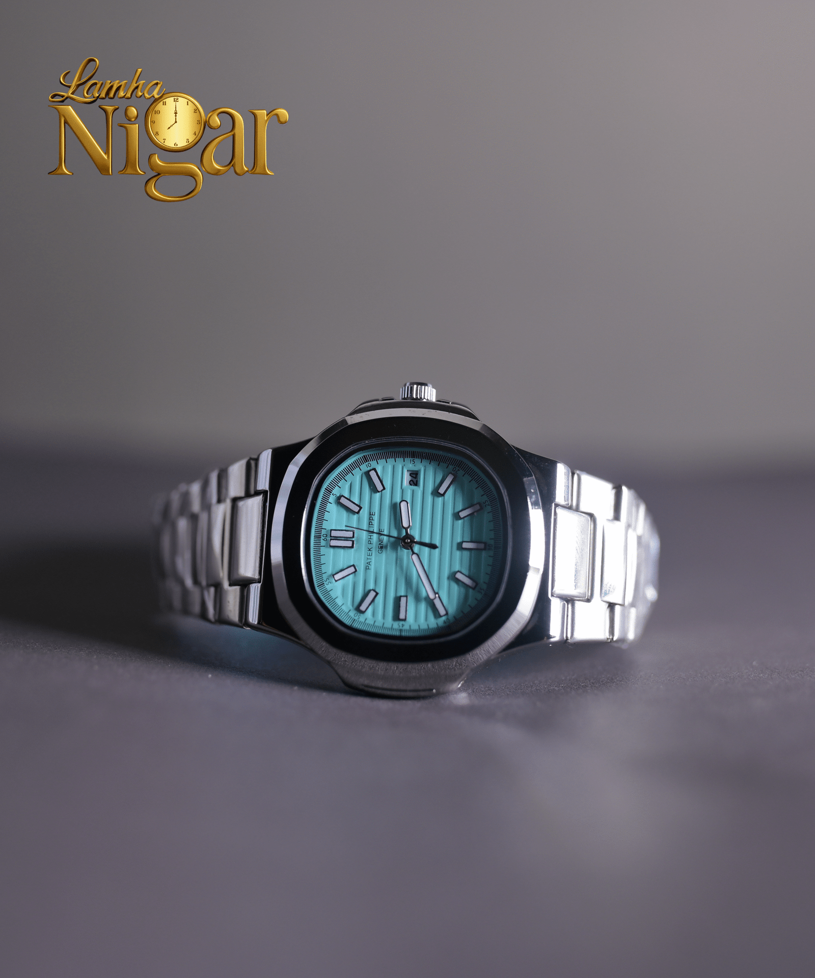 Introducing the elegant and modern Patek Philippe blue dial watch – a premium choice for men and boys who appreciate refined luxury with a unique color twist. This silver watch for boys features a stunning turquoise/blue vertical-lined dial, designed to draw attention without being loud.